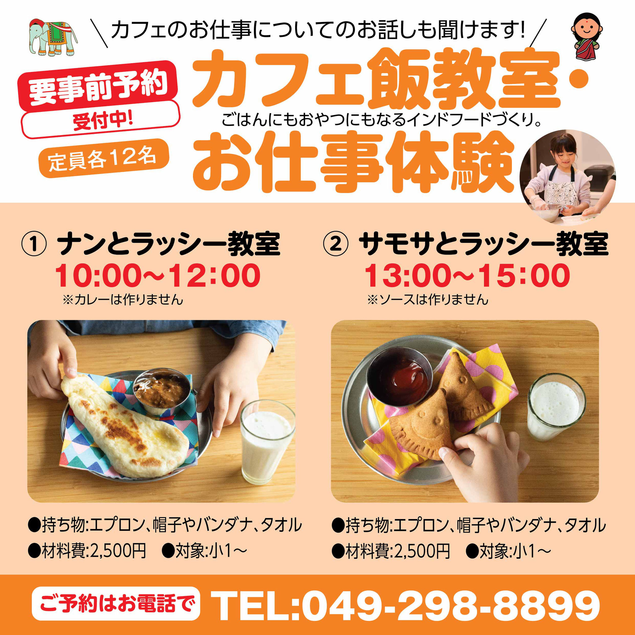 今年の調理室では、カフェ飯教室を開催!ごはんにもおやつにもなるインドフードづくり!カフェのお仕事も聞いてみよう!大人の参加も大歓迎です!事前予約お待ちしています!